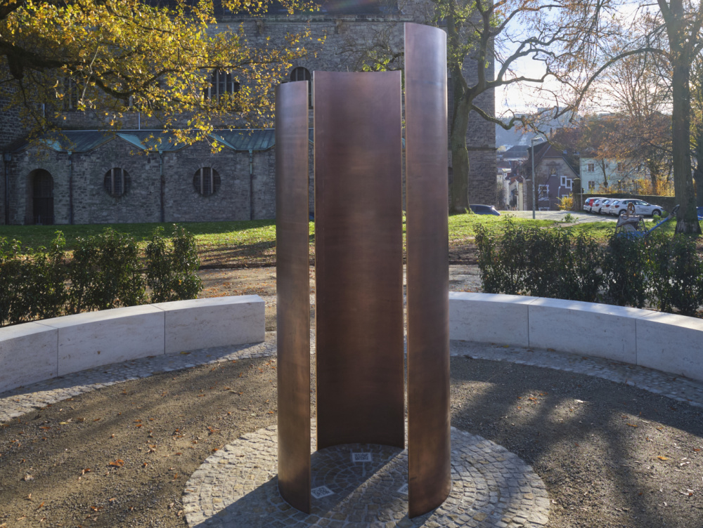 Der Gedenkort besteht aus verschiedenen Elementen und Medien, die alle auf die gemeinsame Mitte verweisend, eine imaginäre Leere umrunden. Zentral auf einem kreisförmigen Platz befindet sich das skulpturale und interaktive Mahnmal. Drei radial geformte Segmente aus Bronze umfassen in verschiedenen Größen die gemeinsame Mitte. Die Gestaltung symbolisiert mit der gefassten Leere den erlittenen Verlust – den Verlust jedes einzelnen geliebten Menschen, ihrer Stimmen und der gemeinschaftlich gelebten kulturellen Identität.
