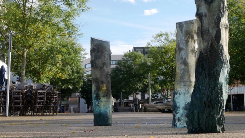 Die Skulptur aus 40 bronzenen und 1,10 Meter hohen Baumstämmen gruppiert sich ungeordnet auf dem Platz und ragt ein Stück in die Freitreppe der Berliner Promenade hinein.