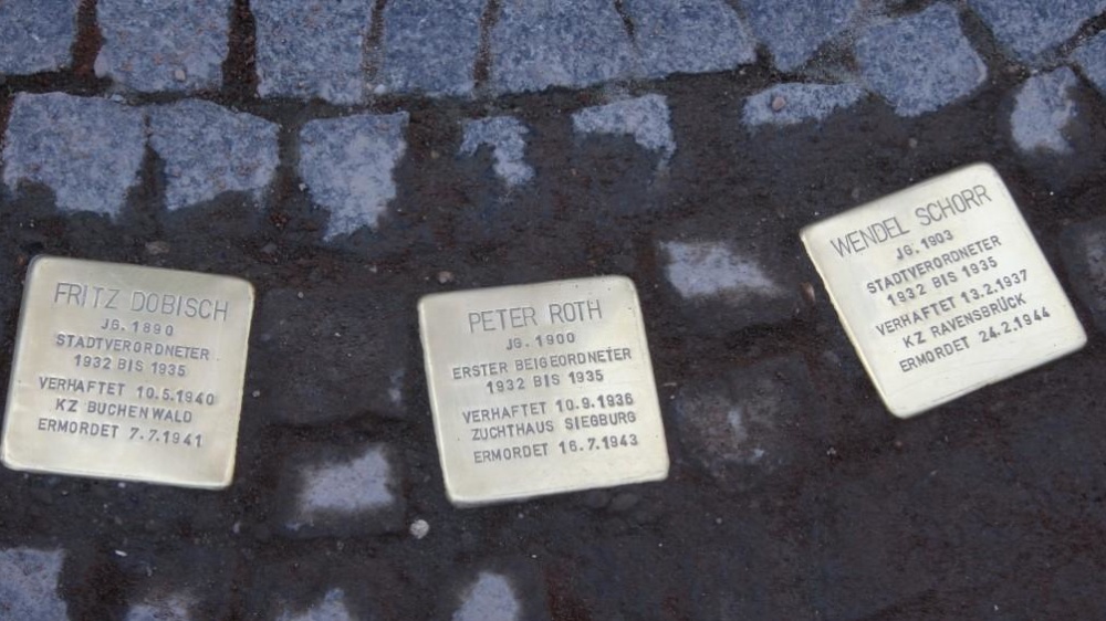 In Gedenken an Fritz Dobisch, Peter Roth und Wendel Schorr hat Gunter Demnig im April 2011 drei Stolpersteine vor dem Saarbrücker Rathaus verlegt.