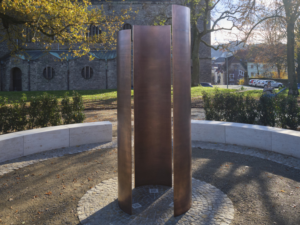 The memorial site consists of various elements and media that all point to the common centre and encircle an imaginary void. The sculptural and interactive memorial is located in the centre of a circular square. Three radially shaped bronze segments of different sizes surround the joint centre. The design symbolises the loss suffered - the loss of each individual loved one, their voices and the shared cultural identity.