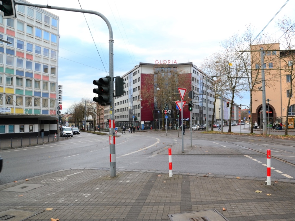 Hier sind zwei Fahrstreifen in Richtung Westspange sowie ein Fahrstreifen in Richtung Congresshalle geplant. Die straßenbegleitenden Radwege werden auf dem Niveau der beidseitigen Gehwege geführt. Ein Sicherheitsstreifen von 50 cm ist vorzusehen. An der Grünfläche im Bereich der Bundesbank werden bestehende Einfassungen zurückgebaut. Die letzten Längsparkstände vor dem Knotenpunkt einschließlich der angelegten Baumquartiere entfallen zugunsten des Radfahrstreifens.