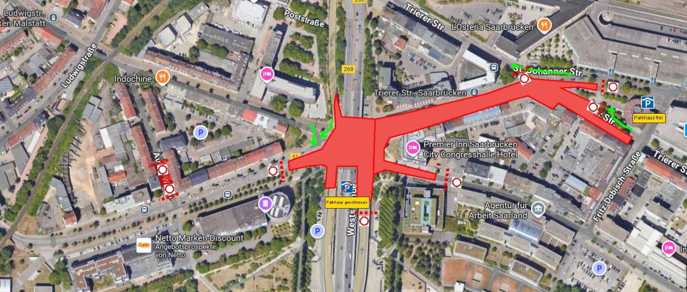 - Sperrung der St. Johanner Straße ab Hausnummer 49 (neuer Kreisel) bis Hausnummer 37 sowie Sperrung des Knotenpunkts St. Johanner Straße/Trierer Straße.