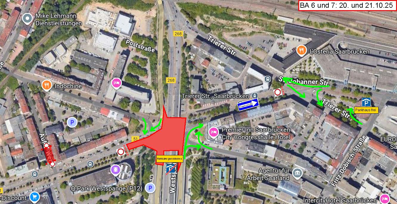 - Weiterhin Sperrung der St. Johanner Straße von Hausnummer 102 bis 110 (weiterhin keine Durchfahrt nach Burbach/Malstatt).