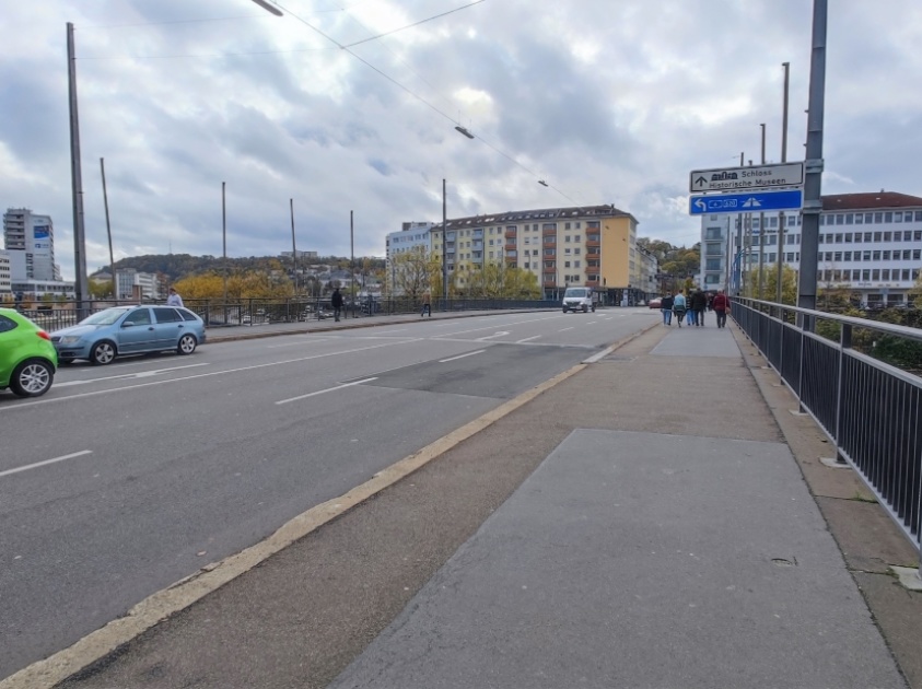 • Die Kfz-Verkehrsbelastung auf der Brücke beträgt rund 10.000 Kfz/Tag, wobei die Fahrtrichtung nach St. Johann mit circa 7.300 Kfz/Tag deutlich stärker belastet ist als die Gegenrichtung mit circa 2.900 Kfz/Tag.