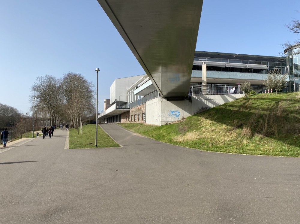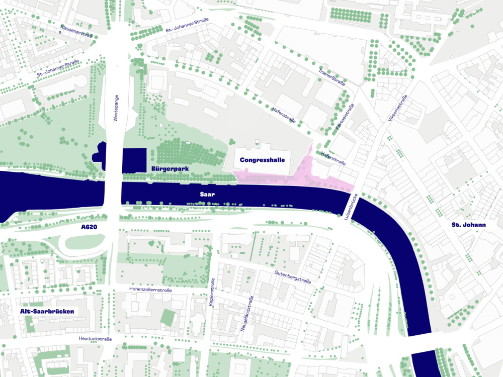 Durch die Modellierung der Böschung zwischen dem östlichen Vorplatz und der Zuwegung zum Willi-Graf-Ufer (Saarufer) wird die Sichtachse zwischen der Bebauung und der Saar wieder hergestellt werden.